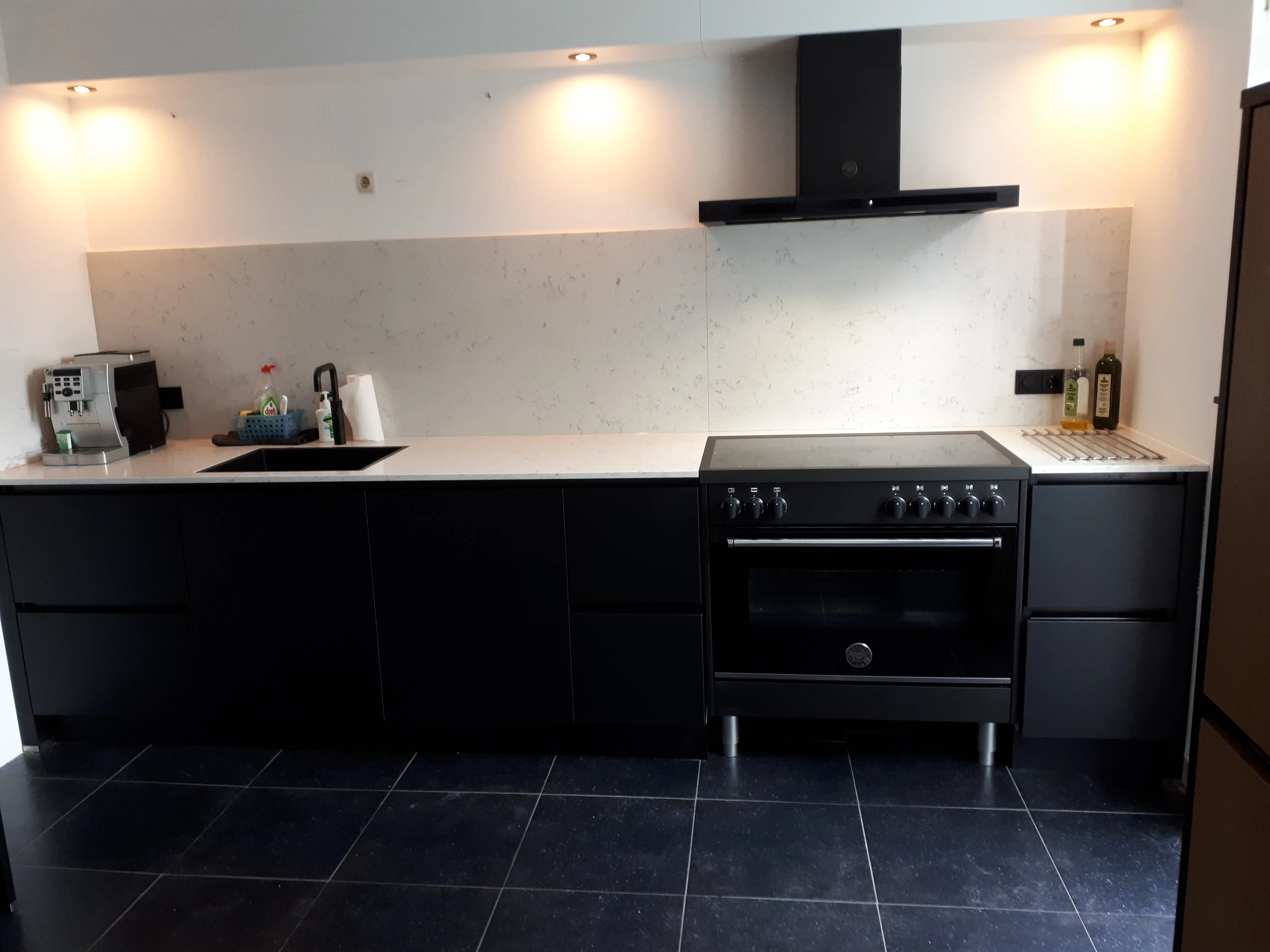Deze keuken is voorzien van een Sylestone Lagoon composiet keukenblad met een suède afwerking. Compleet met beschermende achterwand en een geïntegreerde spoelbak.